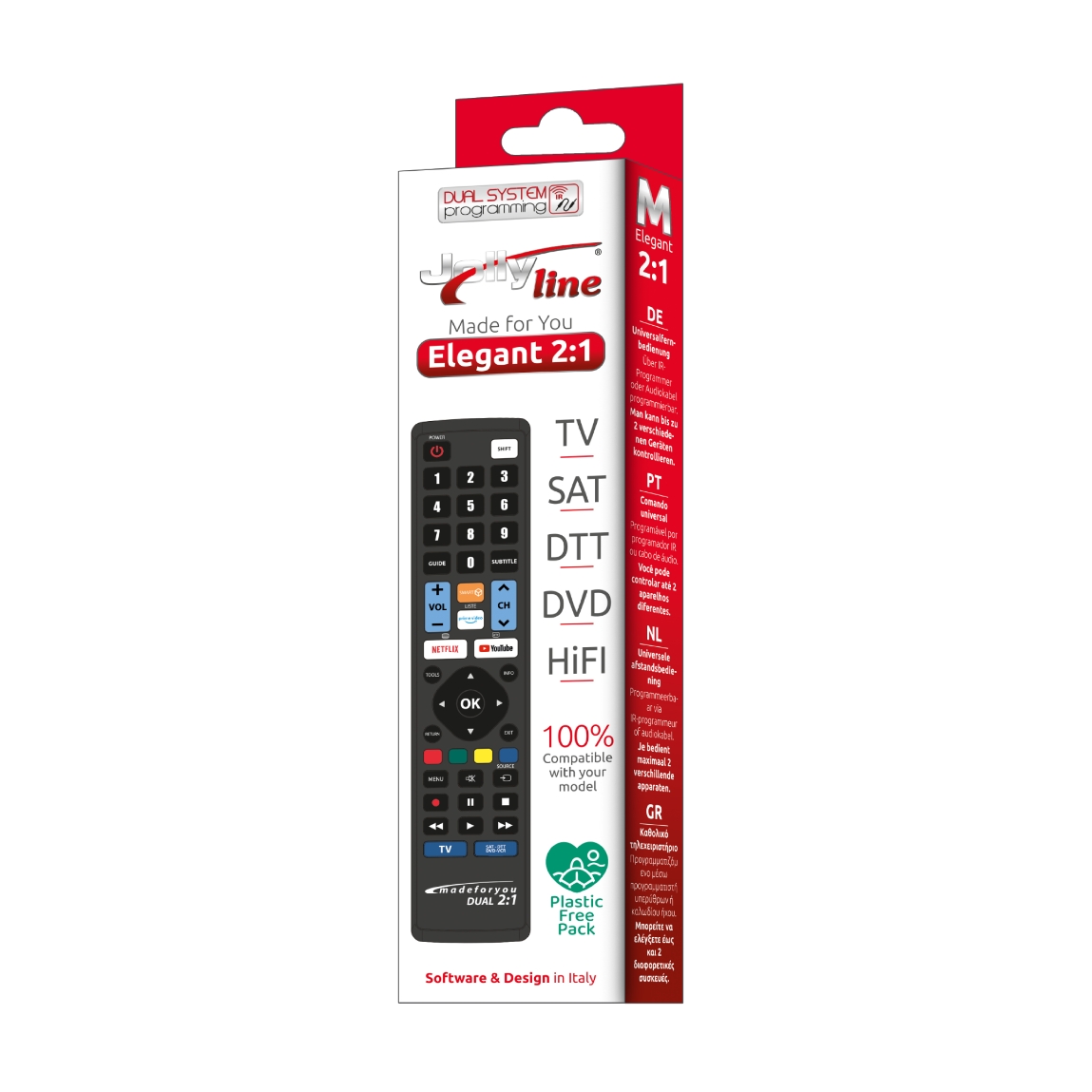 O controle remoto programável universal permite operar até 2 dispositivos de diferentes categorias, oferecendo compatibilidade ampla e controlo total das funções essenciais. A programação é realizada através de um cabo de áudio jack de 3,5 mm, garantindo funcionamento independente do sistema operativo utilizado.