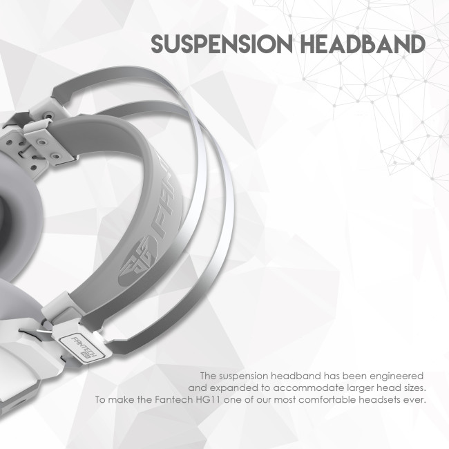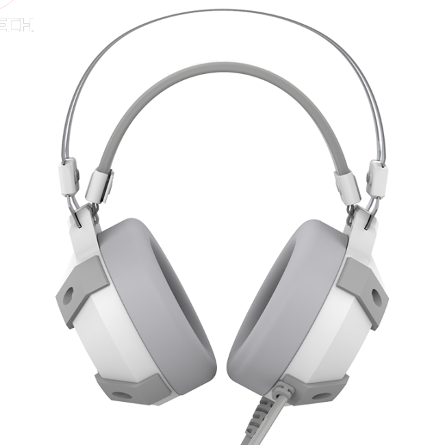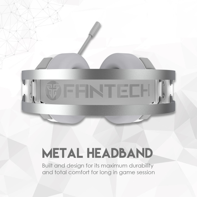 Fone de ouvido FANTECH cinzento e branco com microfone e estrutura metálica prateada