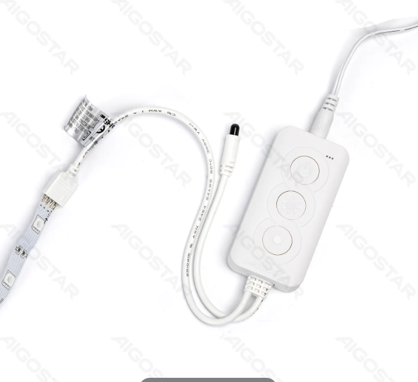 Fita LED com controlador branco e três botões circulares em fundo branco