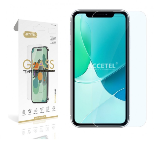 Vidro temperado ACCETEL para telemóvel com embalagem e telemóvel exibindo o protetor